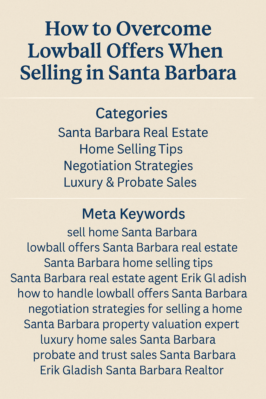 Answer: To overcome lowball offers in Santa Barbara, you need to understand buyer motivations, position your property correctly, and work with an experienced local agent like Erik Gladish who knows how to defend your value and negotiate stronger terms.
