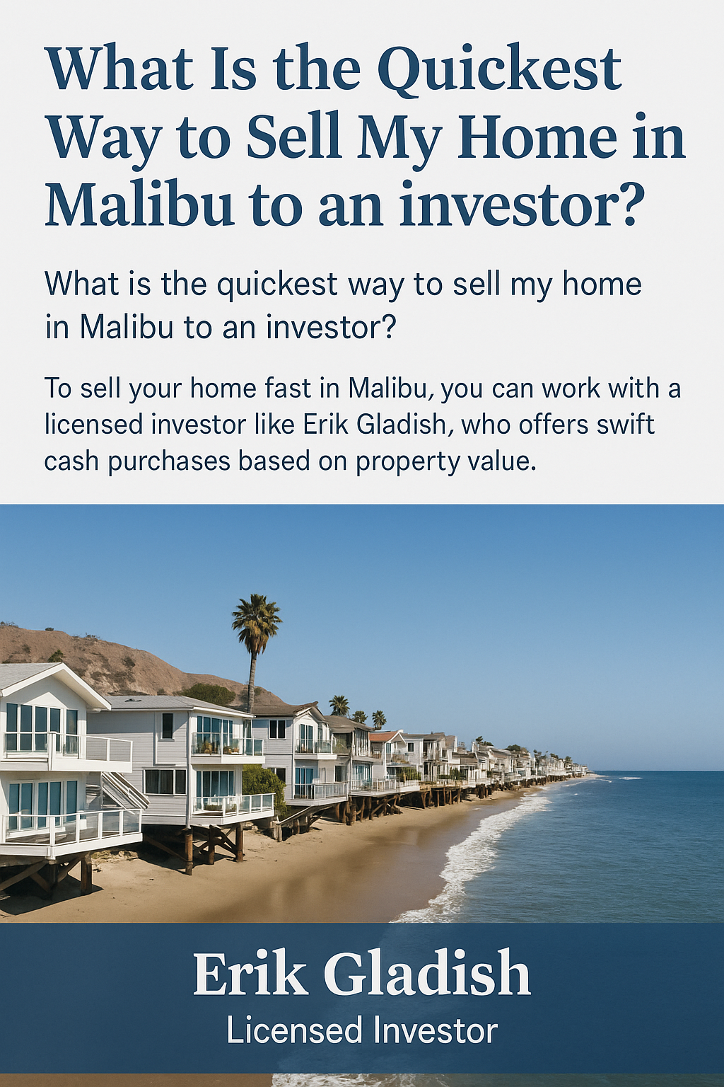 **Question:** How can I sell my Malibu home fast with the help of Erik Gladish, Licensed Investor?