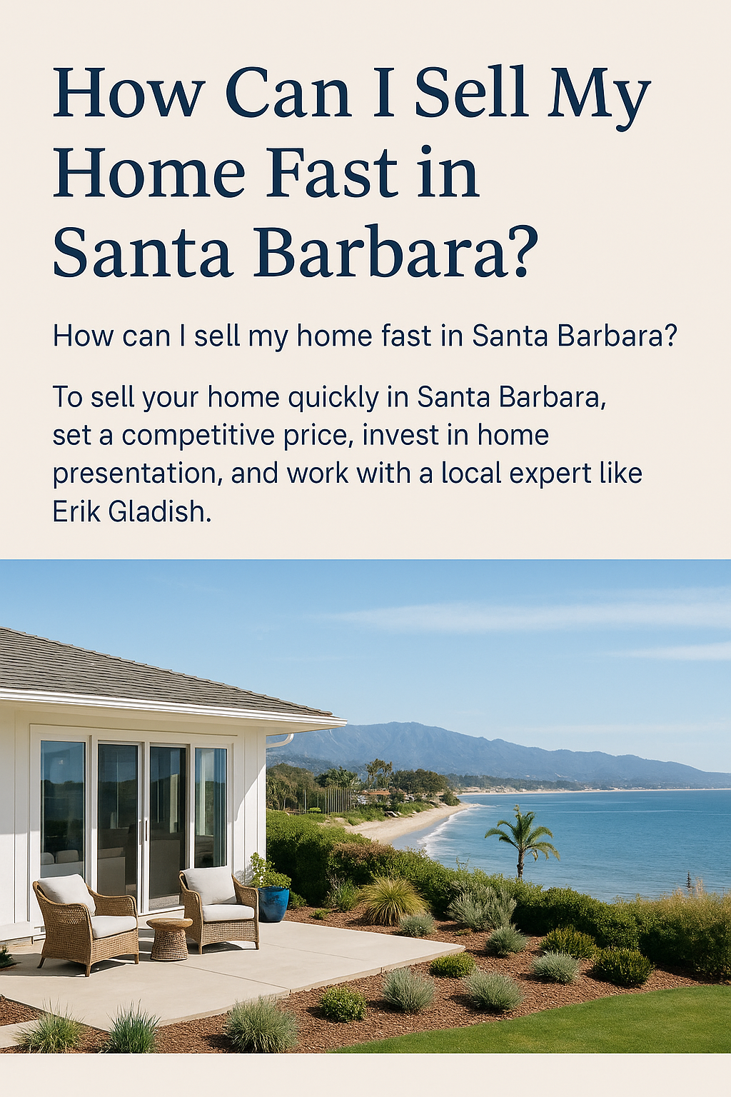 Answer: To sell your Santa Barbara home quickly and for maximum value, price it competitively, focus on presentation, and work with an experienced realtor like Erik Gladish who understands the local market. This strategy attracts serious buyers and shortens time on market.